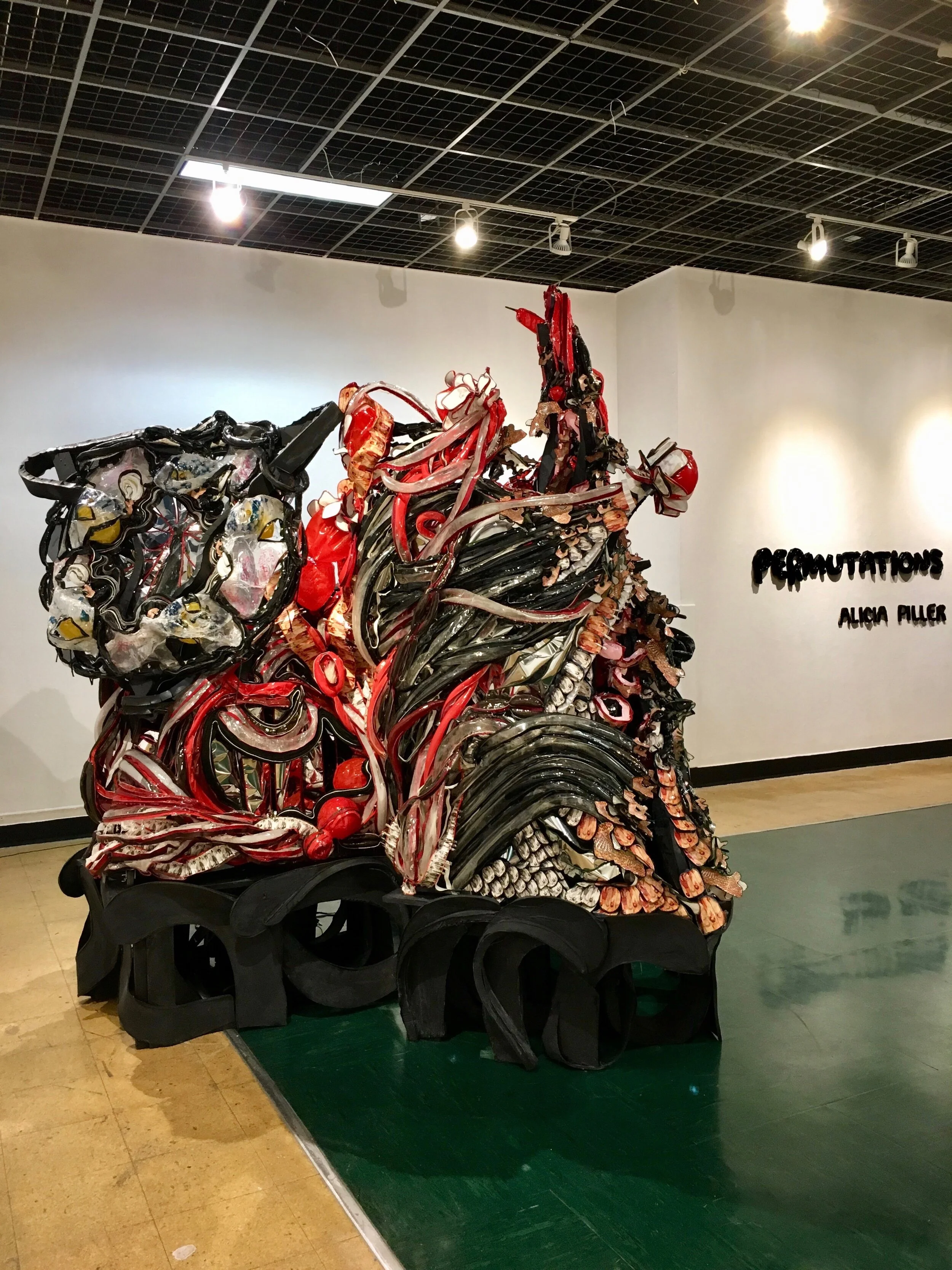 Piller’s piece in Band of Vices, “Psychopathic roots. Contorted realities, sprouting lotuses (9ft X 21 ft X 10 ft)” combines ideas from two of her previous pieces, “Maternal DNA Strain 5” and “Across the wasteland, a twisted melody. Matter and spirit” in order to create a piece that shows maternal DNA overcoming the historical wasteland of politics and societal norms. She hopes to use her voice to strengthen future generations of previously underrepresented people.