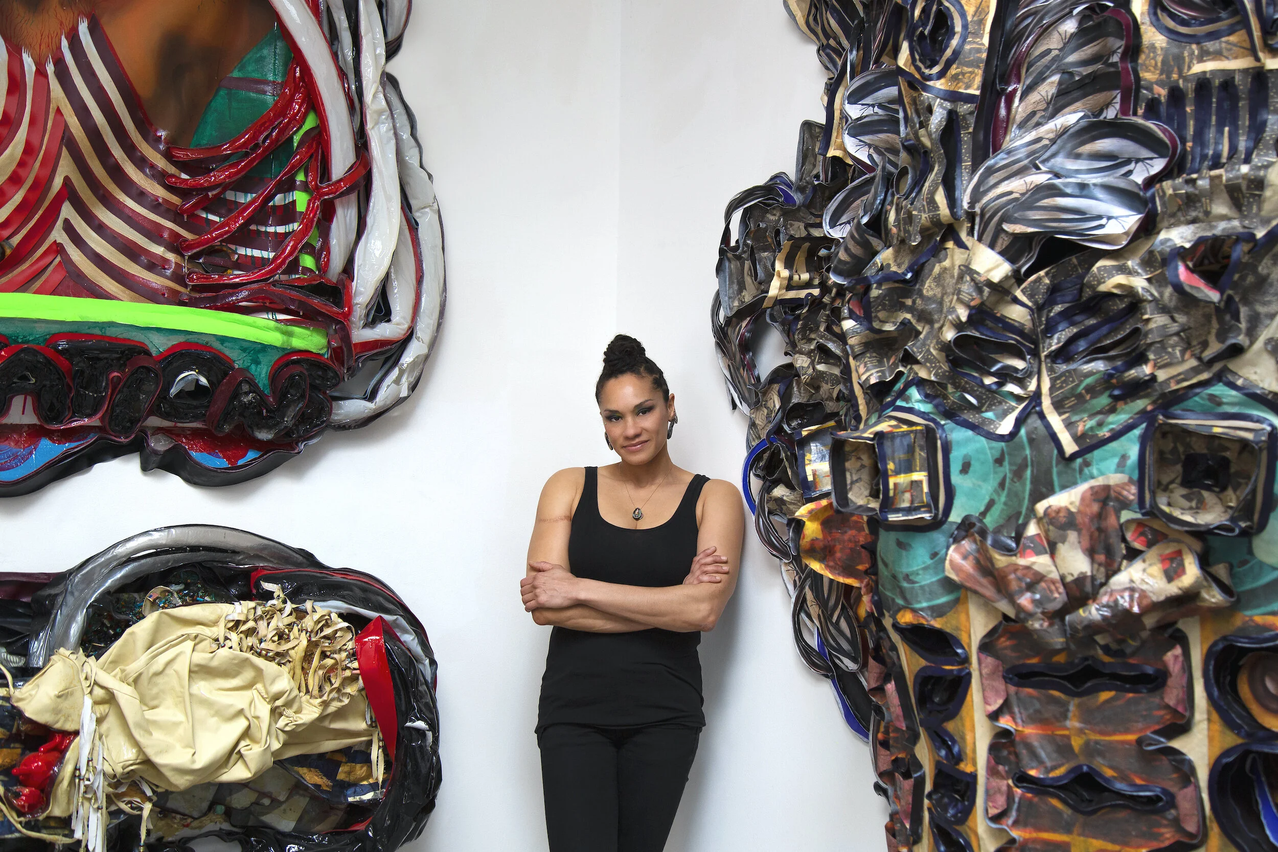 “My use of mixed media materials stems from all my life experiences; melting all of my art practices together into one,” continues. “The use of vinyl pulling from my past working with fashion creating sculptural jewelry pieces; the vinyl in the sculptural works become the skin and membrane that pieces each work together with.”