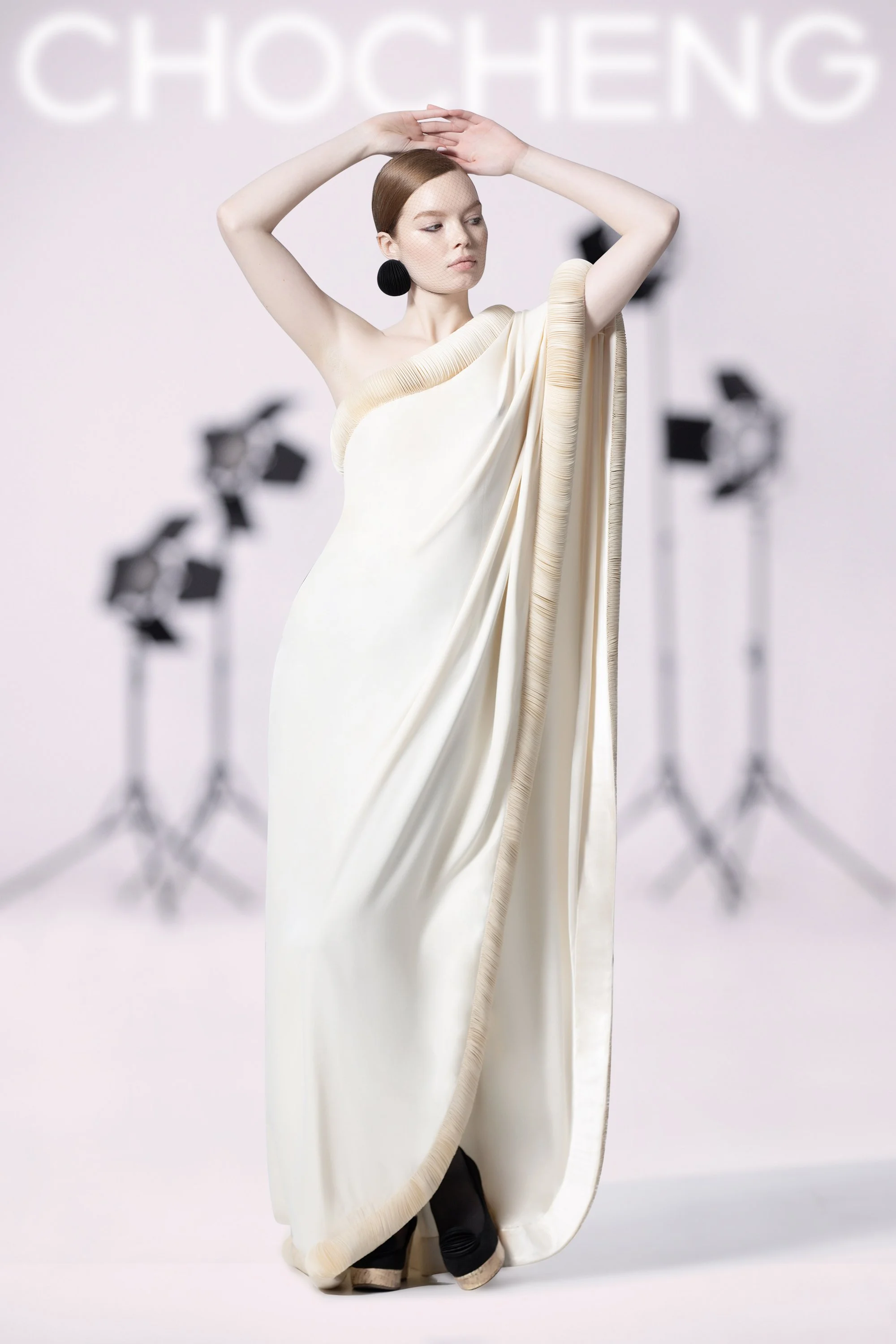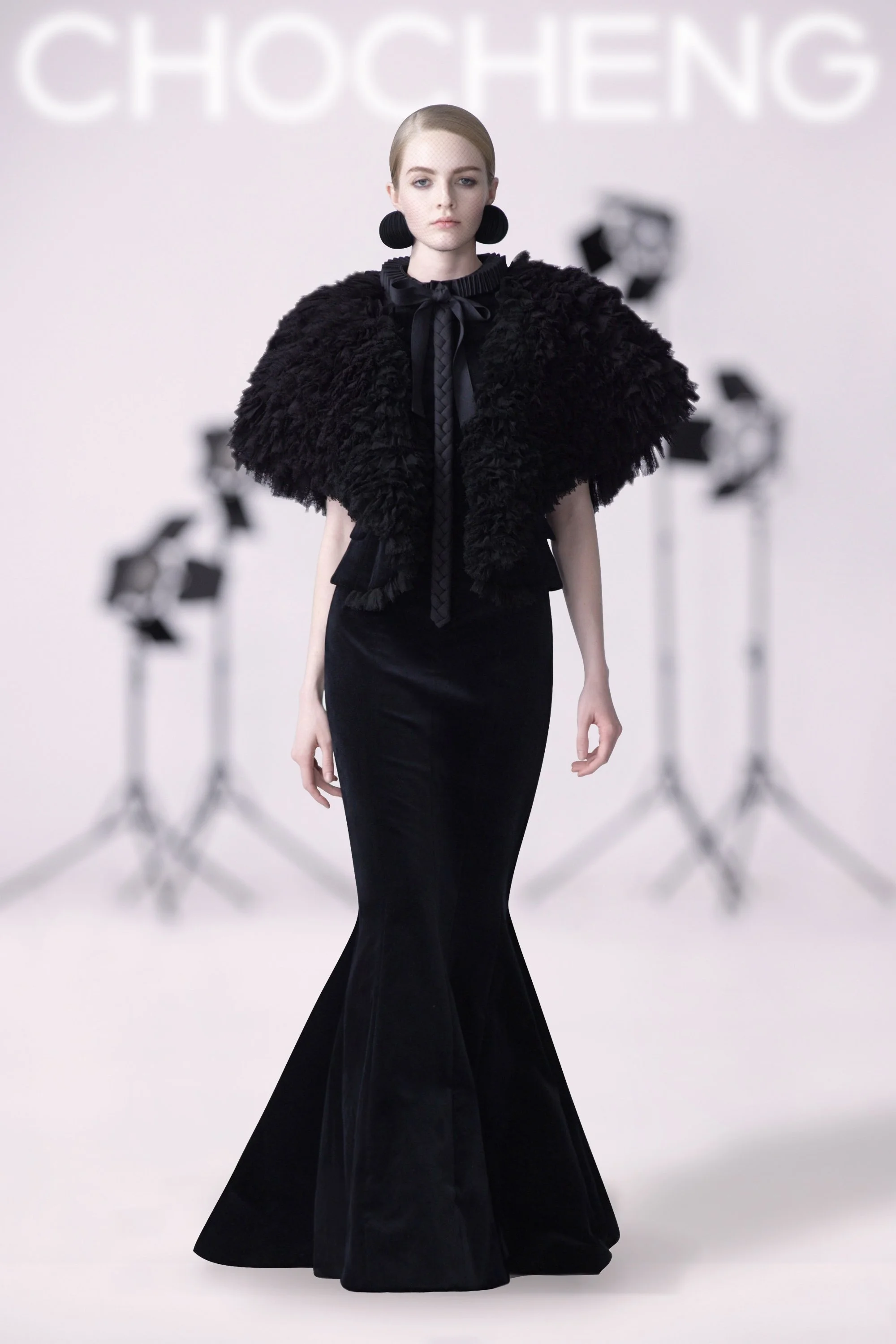 CHOCHENG’s signature design of hand sewn petals continued from the first collection, and was showcased this season in the form of a bolero top. The wavy front of the bolero consisted of hand sewn petals, which created a visually popping effect and presented a seductive cutout design. The black top also featured feminine round shoulder cap sleeves and was paired with a long skirt with a front slit. Adding to the monochromatic outfit, the model also styled a black hand ruched tulle on her arms.