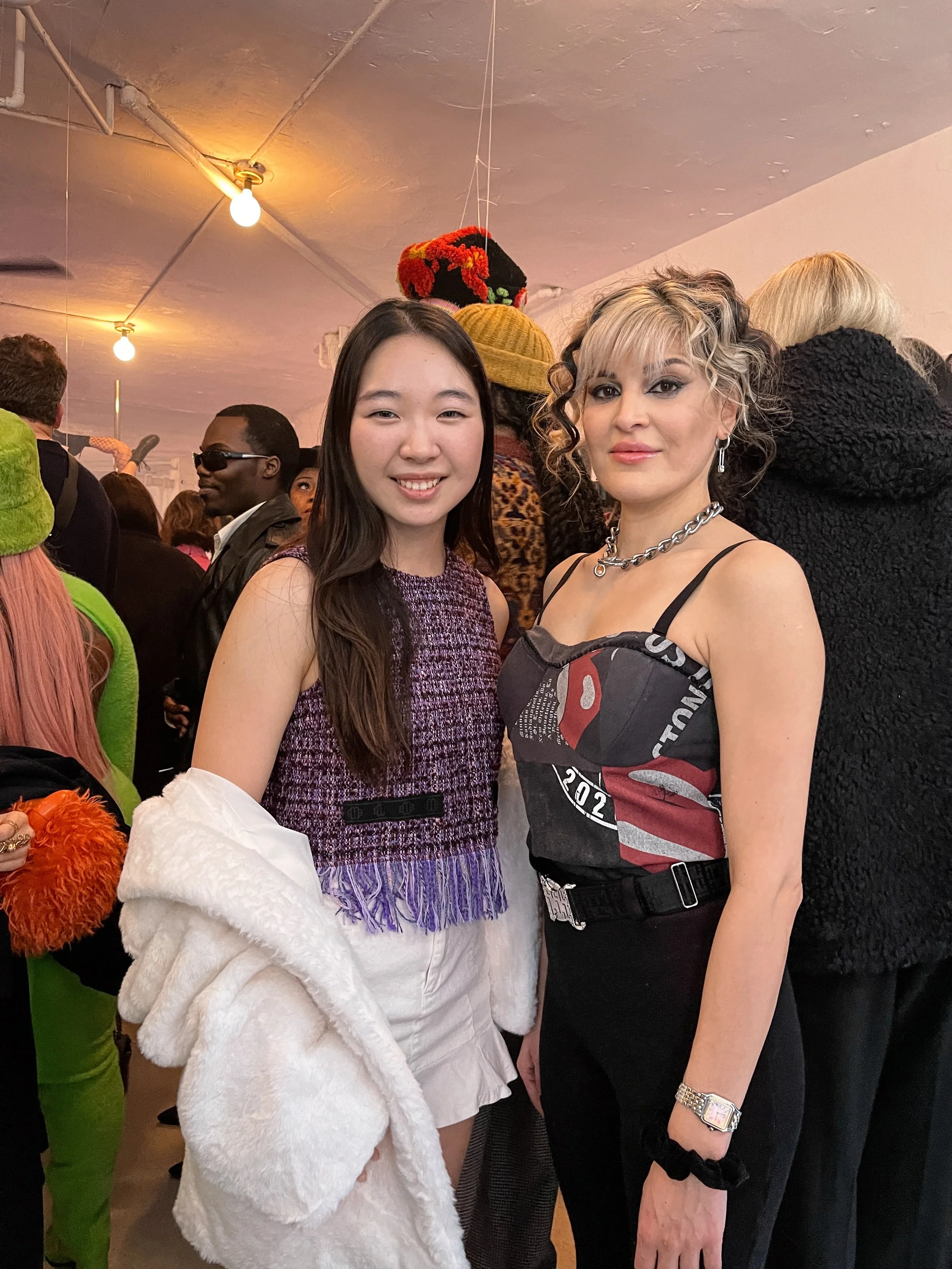 At the start of her career, Tara wanted to turn old t-shirts into luxury items, and she eventually created an eco-friendly fashion brand. Given her British background, Tara was inspired by the grungy, rocky aesthetic from British punk culture and added her take on vibrant colors and woven designs. The designs are mainly made with fabrication and textile, which creates the popping textures. The modeled look above features a woven-inspired look that is distinct in contrasting the black and mustard yellow colors.